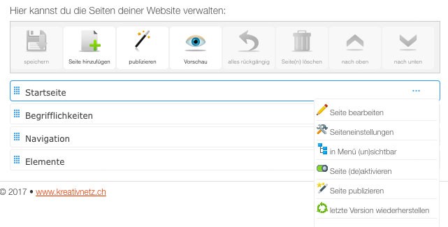 Klickst auf "Seite (de)aktivieren", wird die betreffende Seite beim nächsten Mal, wo du die Website publizierst, nicht mehr online gehen und somit auch nicht mehr im Internet auffindbar sein. Klicke erneut auf "Seite (de)aktivieren", um die Seite wieder zu aktivieren.